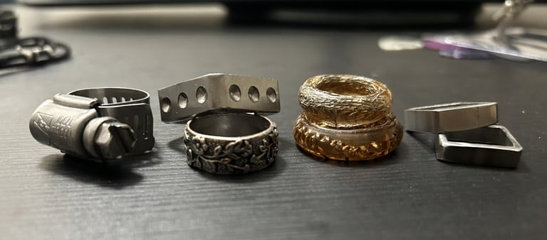 Rings: Hose-clamp, machined square-steel, and resin-encased aluminum chips.