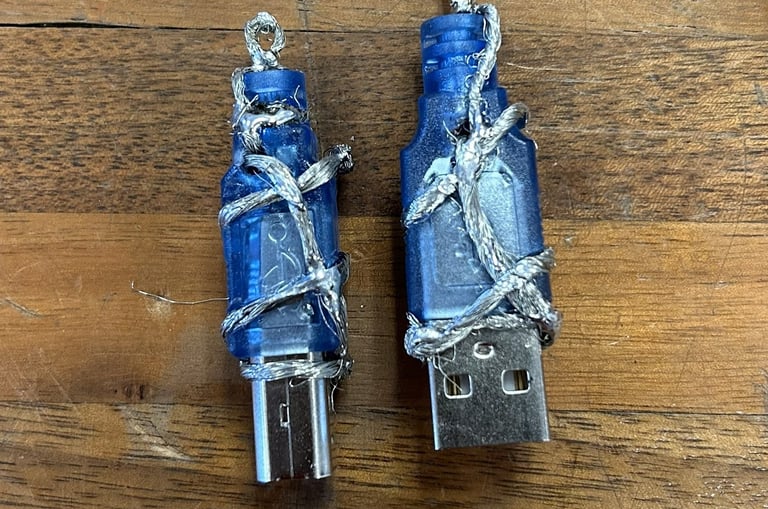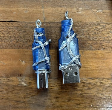 USB-A and -B wired-wrapped necklace charms.