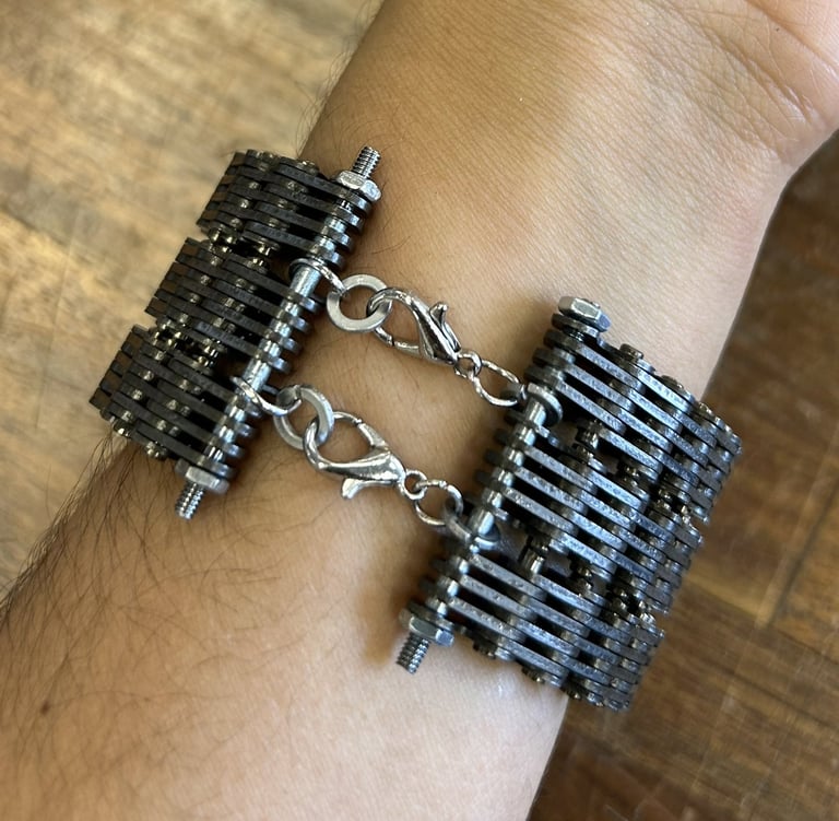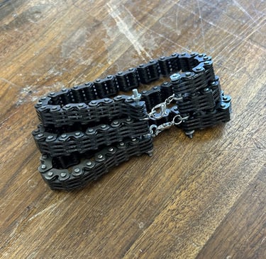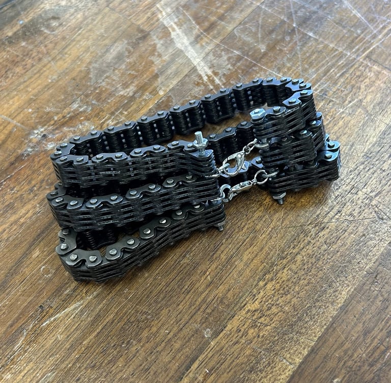 Tri-layer motorcycle cam chain bracelet with a custom machined threaded rod.