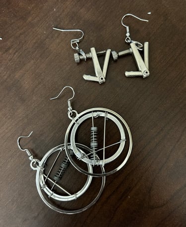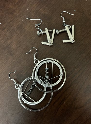 Earrings: Violin tuners; Geometric hoop earrings + ballpoint pen springs.
