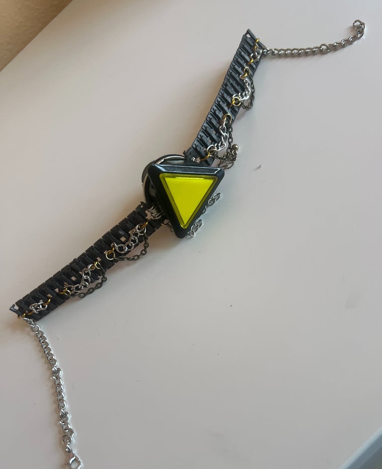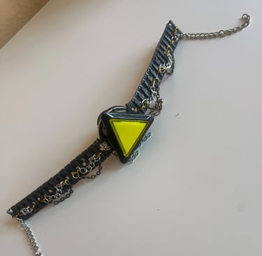 Tire track choker necklace pierced with mixed-metal dangling chains. Removable triangular yellow button fastened in between a center key ring.